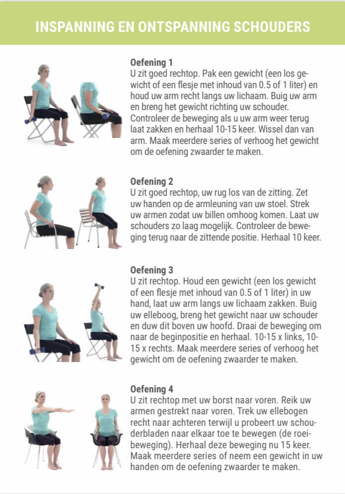 In de Beweegfolder staan deze week specifieke oefeningen voor inspanning en ontspanning van nek en schouders.