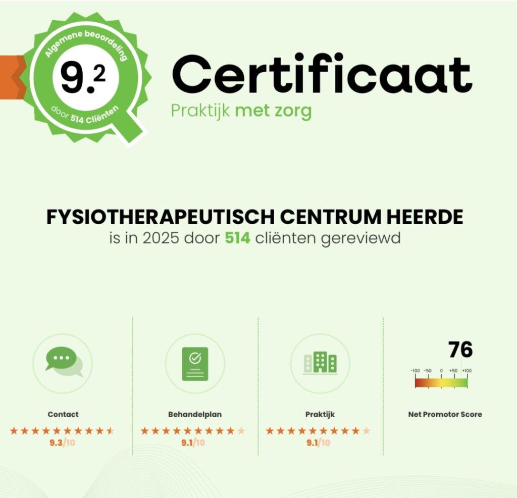 Wij hebben het Qualiview-certificaat “Praktijk met Zorg” over 2025 ontvangen. In 2025 is Fysio Heerde door 514 patiënten beoordeeld met een gemiddelde score van 9,2! Ook onze ergotherapie heeft een 9,2 gescoord en daar zijn wij trots op! We willen iedereen die een klantwaardering heeft gegeven hartelijk danken voor het invullen