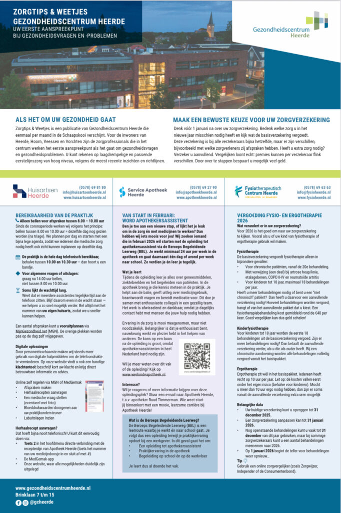 Zorgtips en weetjes is een publicatie van Gezondheidscentrum Heerde die eenmaal per maand in Nieuwsblad Schaapskooi verschijnt. Dit keer met de volgende zorgtips en weetjes: Maak een bewuste keuze voor uw zorgverzekering Huisartsen Heerde: Bereikbaarheid van de praktijk ️Apotheek Heerde: Word apothekersassistenteFysio Heerde: Vergoeding fysio- en ergotherapie 2026